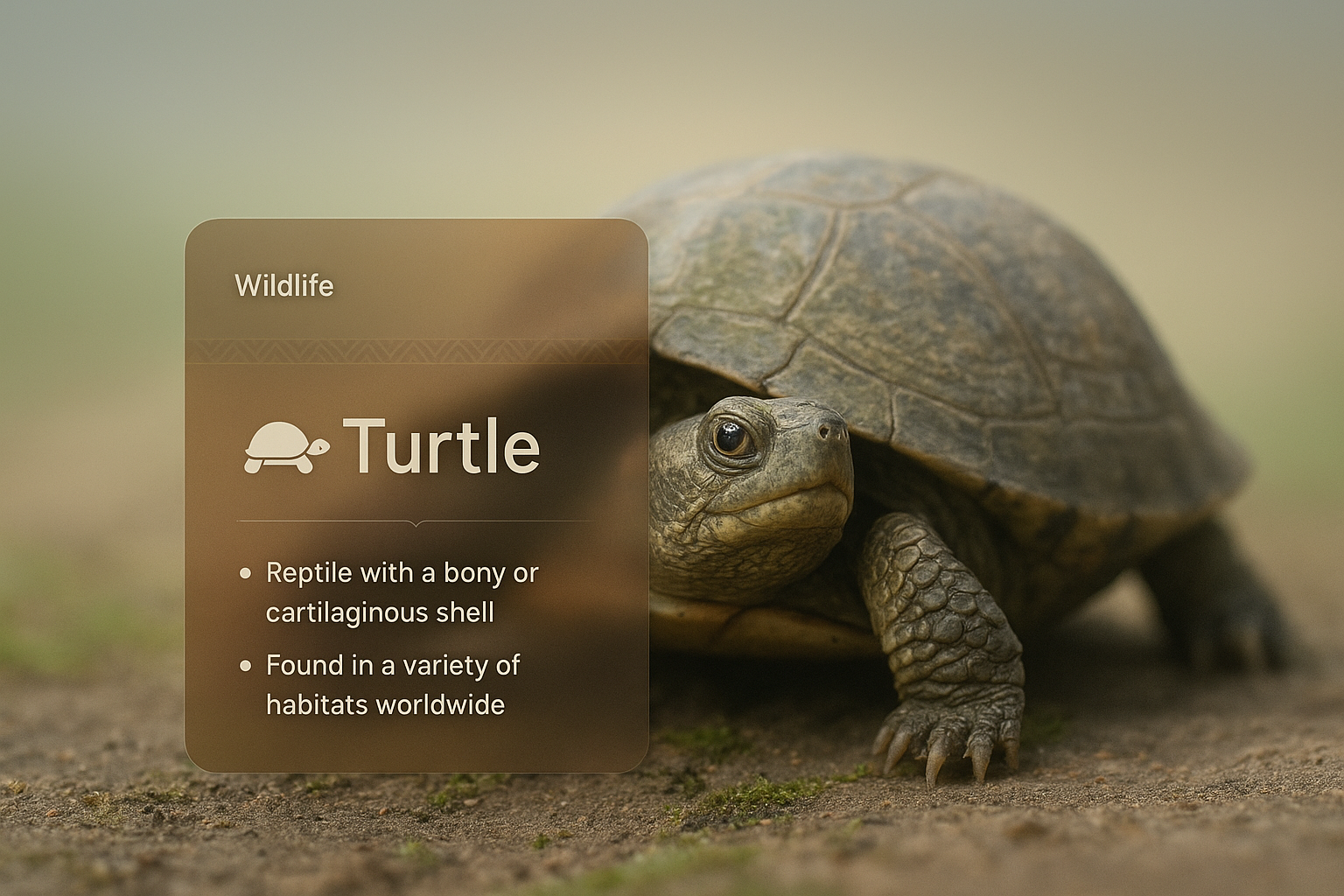 A realistic illustration of a turtle set against a soft gradient background. It features an integrated information card detailing the turtle's characteristics and habitat.