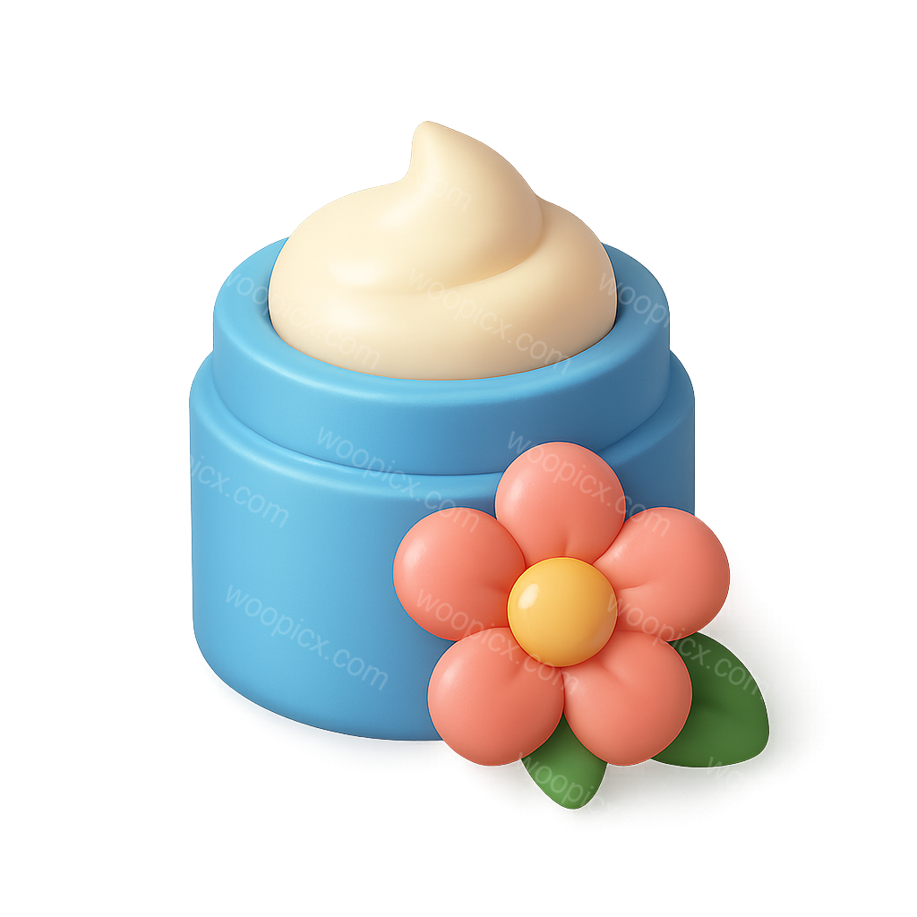/Premium/Collection: /by davooda/Type: PNG/A 3D illustration of a blue container filled with cream, adorned with a colorful flower. The design features a three-quarter isometric view and a volumetric feel, perfect for icons.