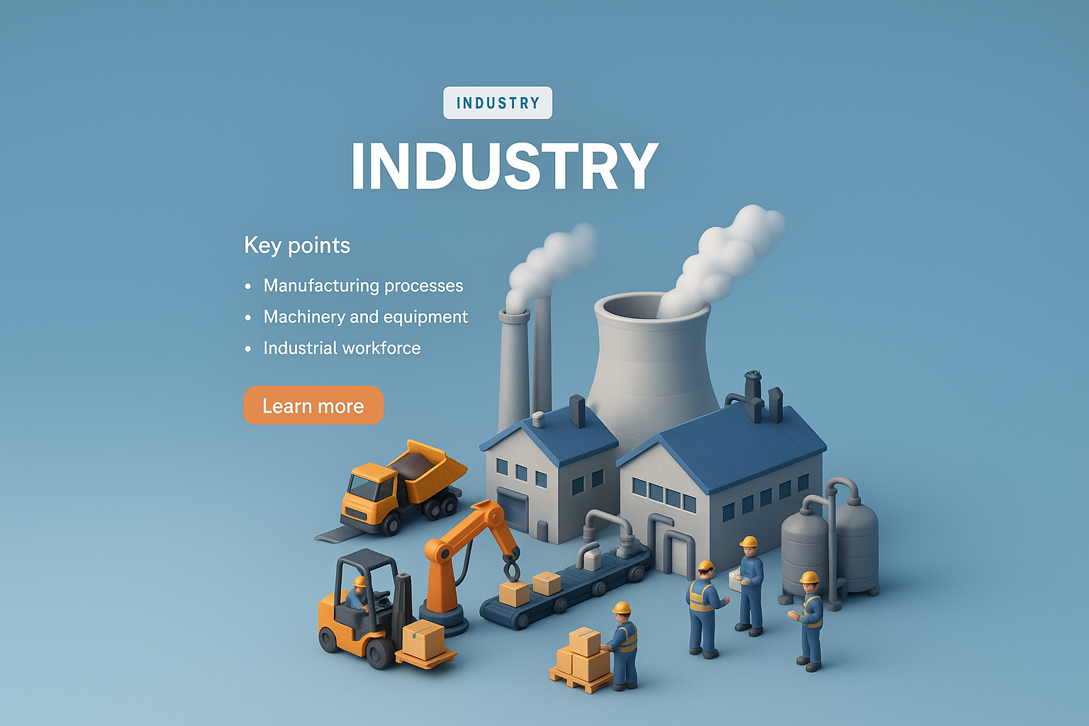 /Collection: /by davooda/Type: PNG/A zoomed-out, realistic 3D industrial scene featuring machinery, workers, and key points highlighted. The background transitions from a gradient to a solid color, creating a cohesive design.
