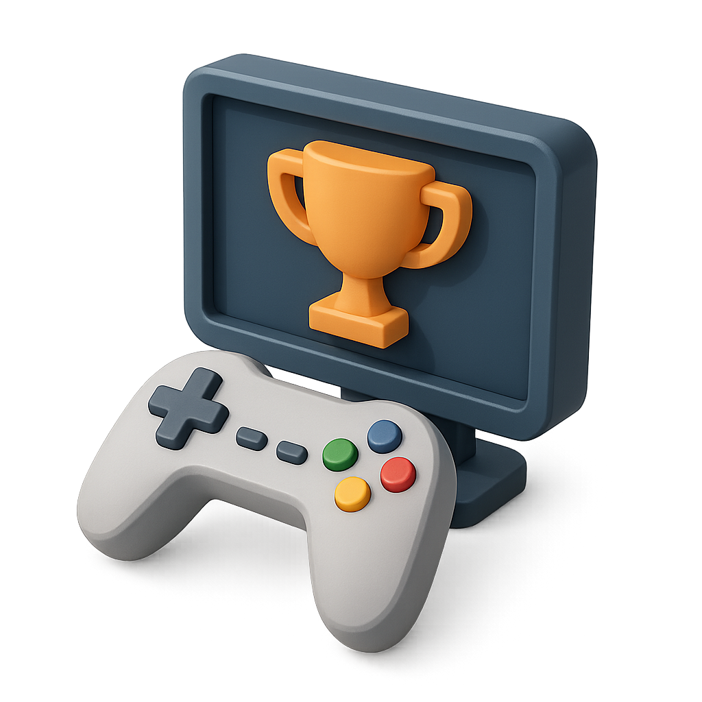 A stylized 3D icon featuring a gaming controller and a trophy displayed on a monitor. The design showcases a transparent background with a three-quarter view and a vibrant isometric style.