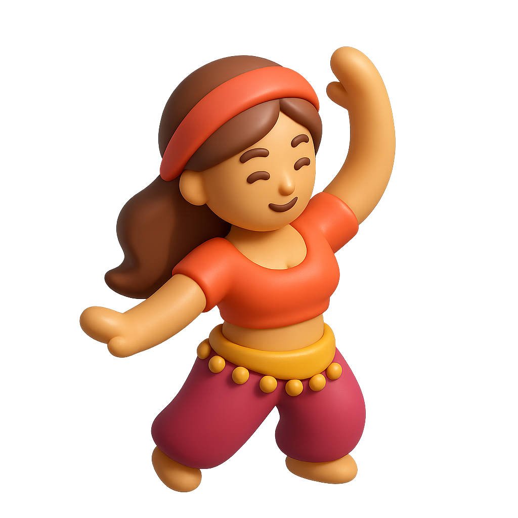 A vibrant 3D icon of a belly dancer in a joyful pose, featuring playful colors and a volumetric design. The character wears a traditional outfit with a headband and decorative belt.