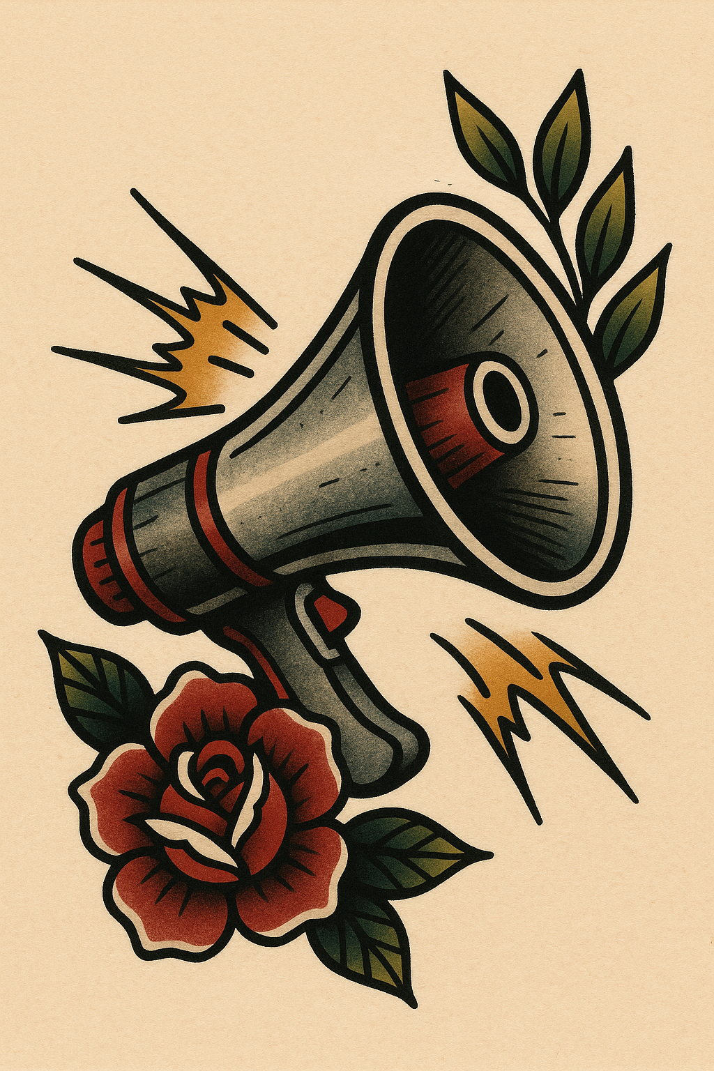 This image features a vintage-style megaphone entwined with a rose, combining elements of communication and nature. It has a bold, illustrative style suitable for posters or merchandise.