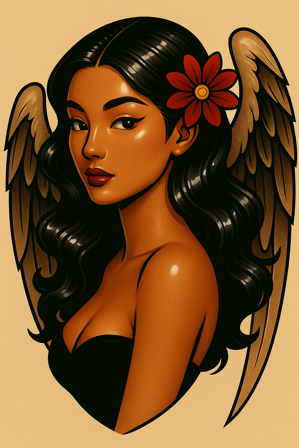 A beautifully illustrated woman with glossy skin and angelic wings, adorned with a red flower in her hair. The composition resembles a classic tattoo style with a soft beige background.