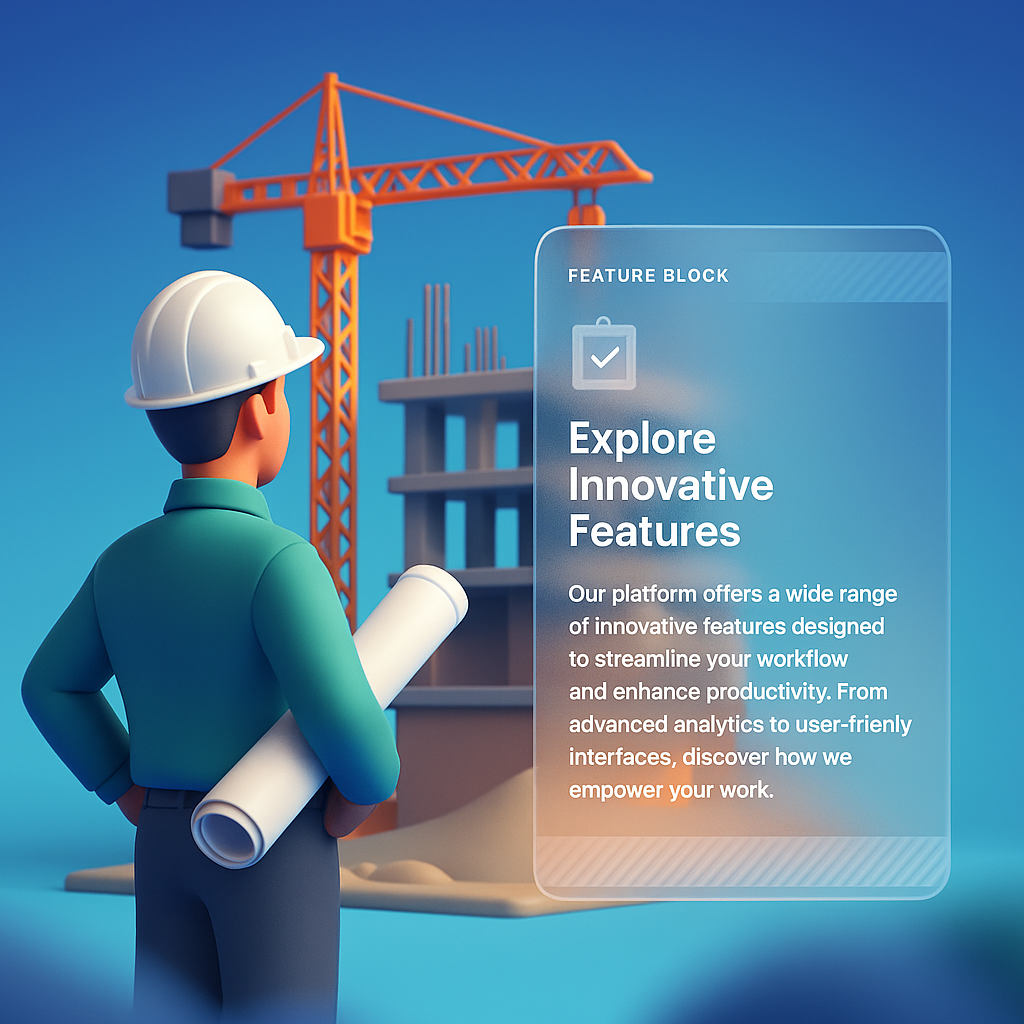 /Collection: /by davooda/Type: PNG/A civil engineer stands with a blueprint at a construction site, observing the crane and building structure. The scene features a transparent block showcasing innovative features of a platform.