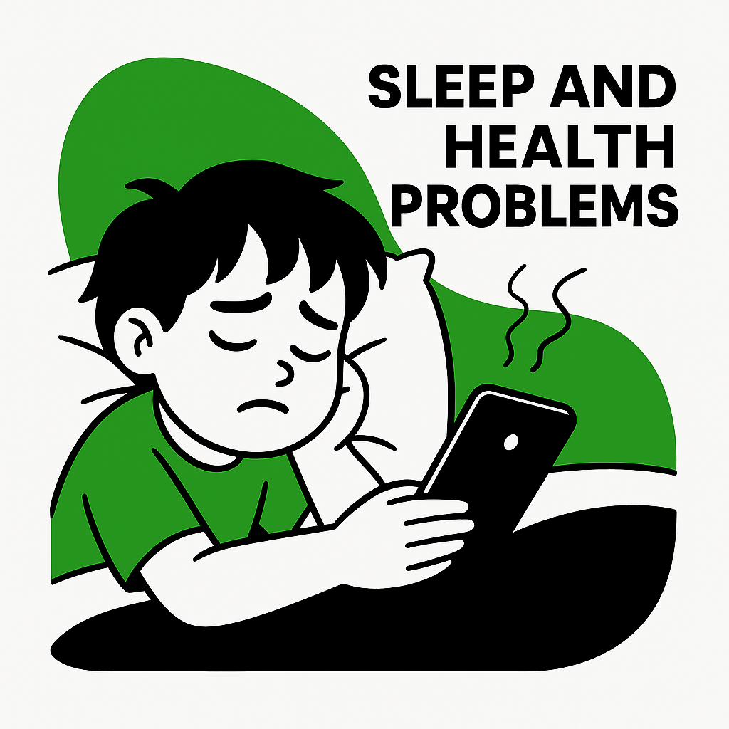 /Collection: /by davooda/Type: PNG/A graphic illustration depicting a child lying in bed while holding a smartphone, conveying themes of sleep deprivation and health problems. The design features a simple, cartoonish style with bold outlines and a minimal color palette.