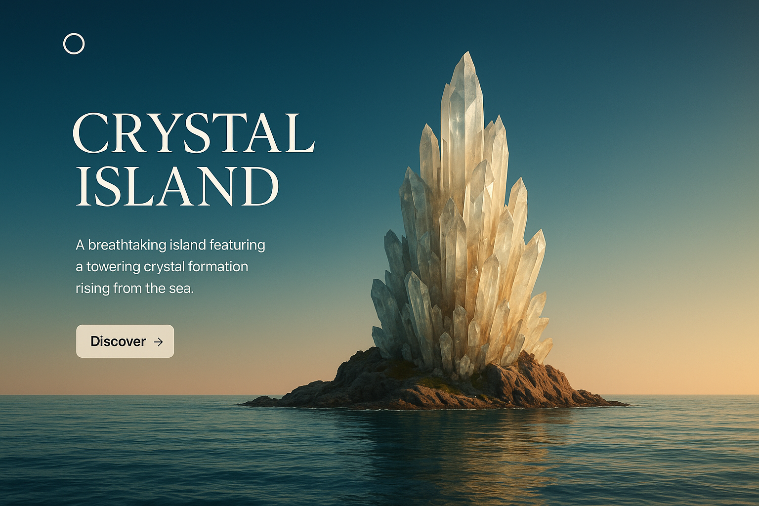 /Collection: /by davooda/Type: PNG/A breathtaking view of a crystal island showcasing a majestic crystal formation rising from calm seas, combined with elegant text elements for a web page.