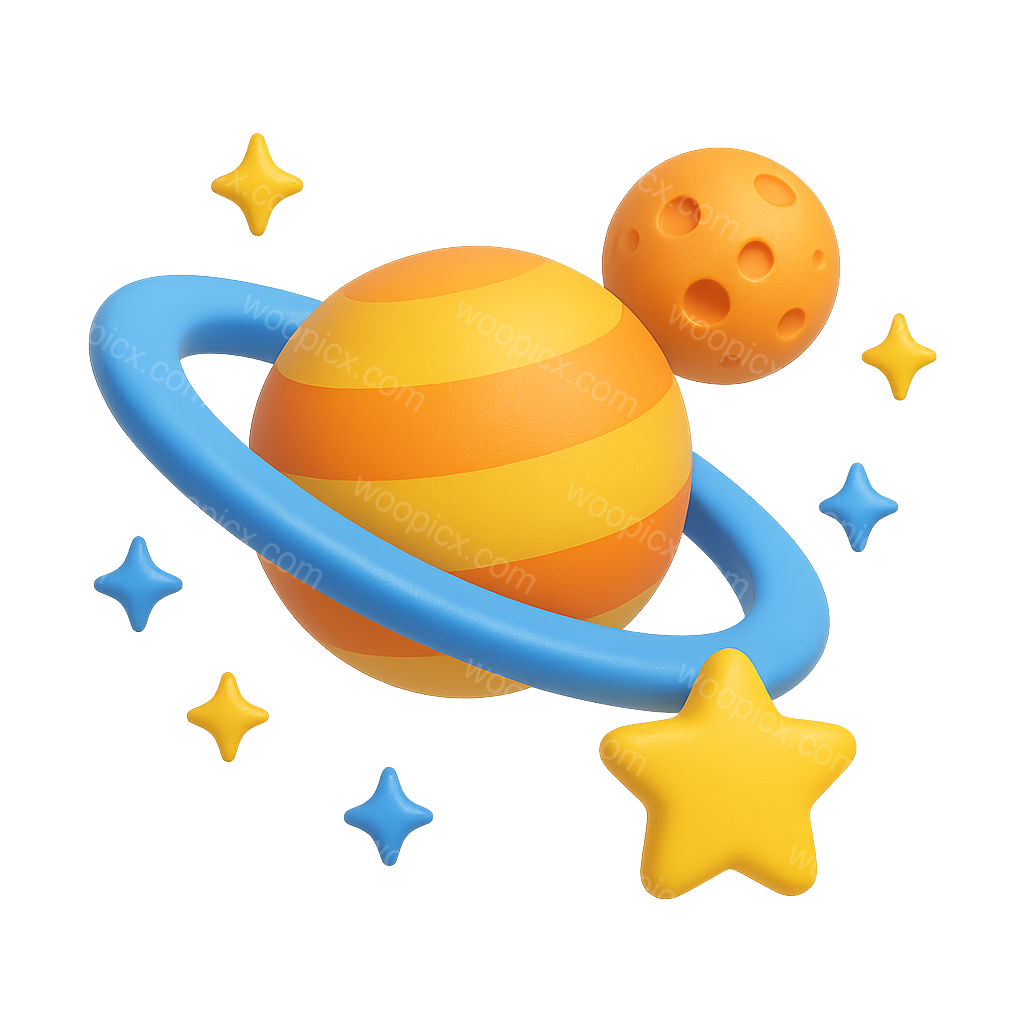 A vibrant 3D illustration of a striped planet with a blue ring, accompanied by a moon and colorful stars. The design features bright orange and yellow hues.