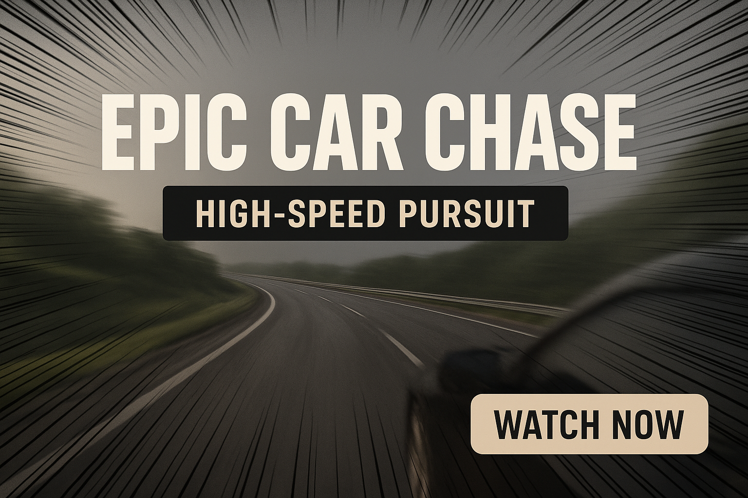 High-energy promotional graphic featuring a car chase theme with motion blur effects, ideal for video marketing and social media engagement.
