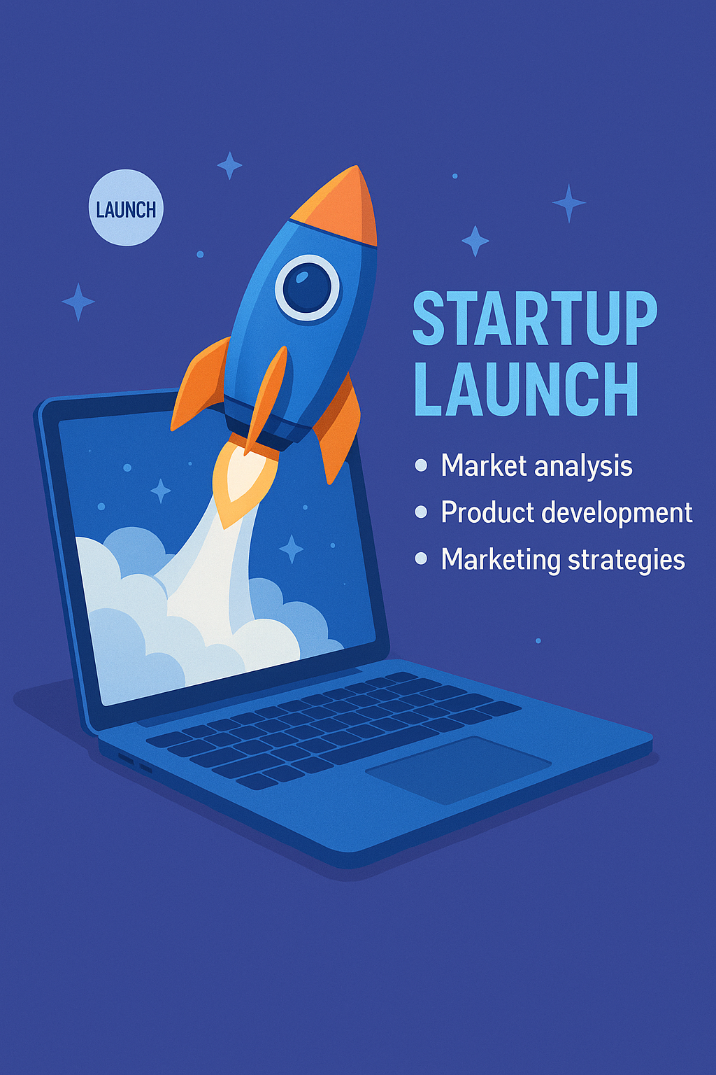 Digital Illustration of Startup Launch Concept with Rocket and Laptop