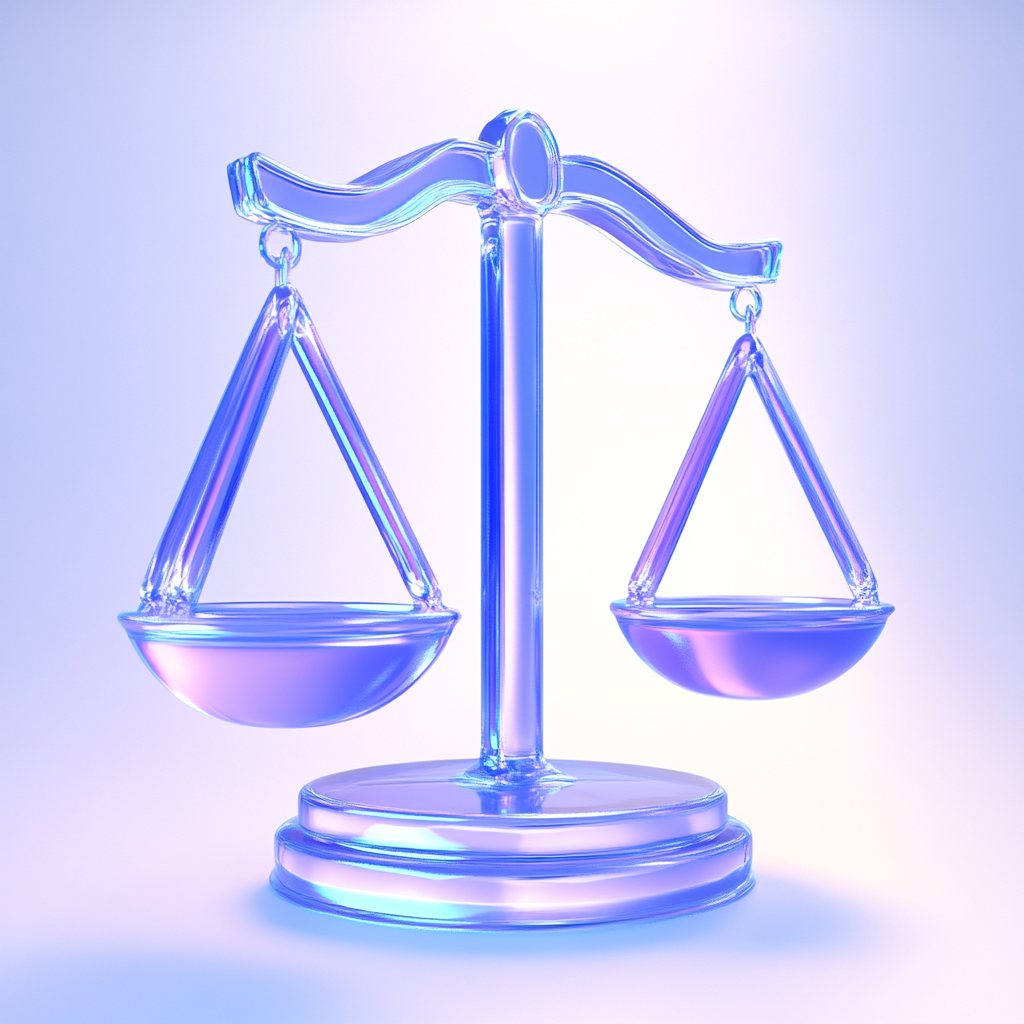 /Collection: /by davooda/Type: PNG/A visually striking illustration of scales of justice, featuring a modern, translucent design with gradient colors, ideal for legal or ethical themes in digital content.