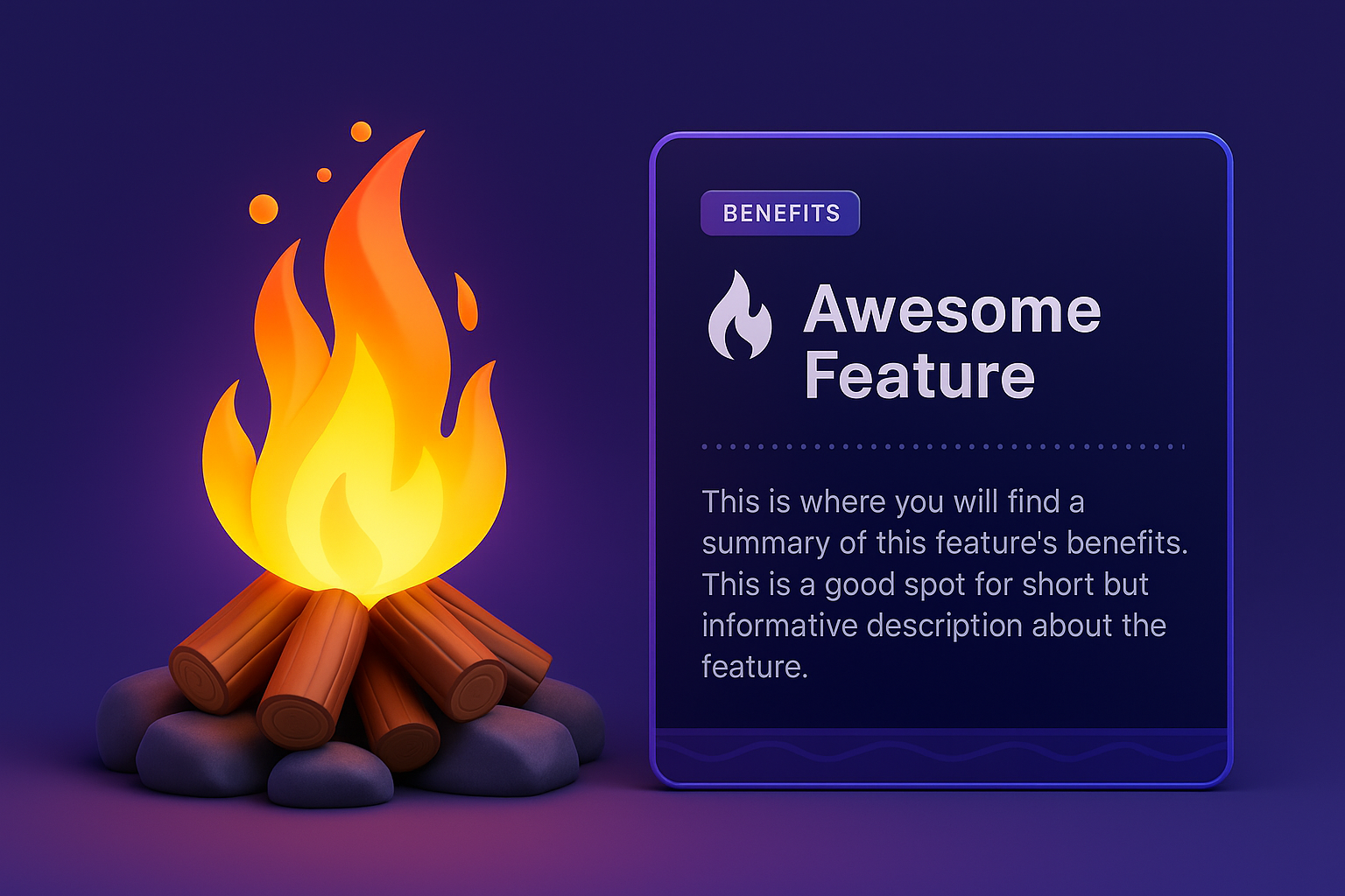 /Collection: /by davooda/Type: PNG/A vibrant 3D illustration of a bonfire surrounded by stones, complemented by a stylish information block showcasing feature details. The background features a smooth gradient.
