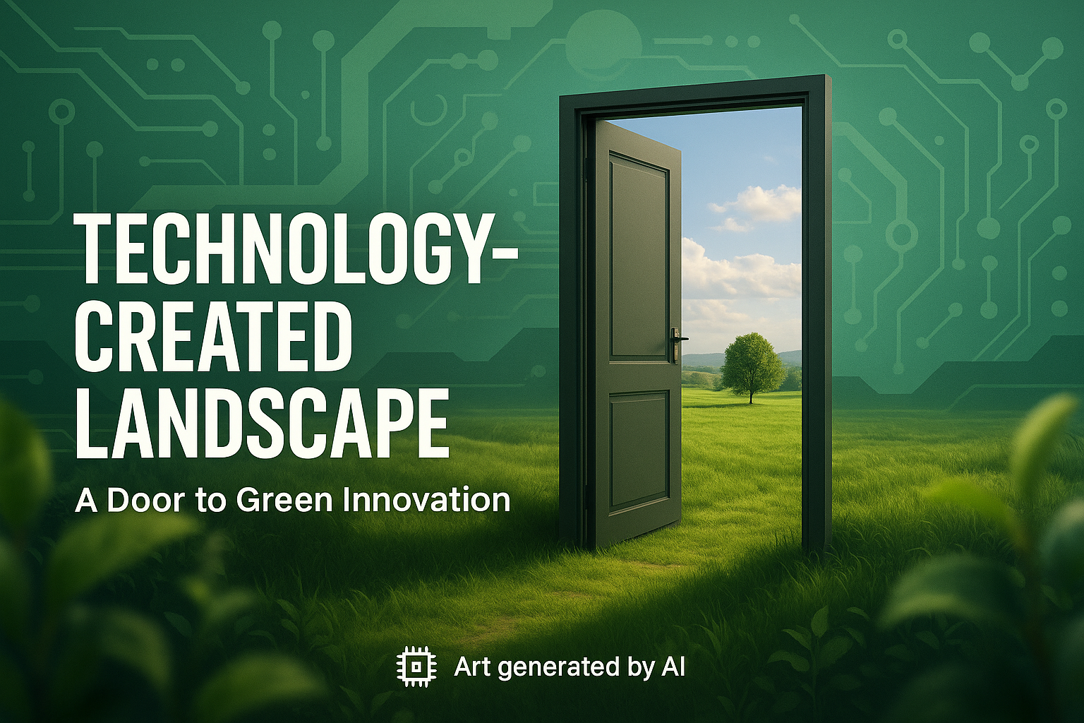 /Collection: /by davooda/Type: PNG/An imaginative digital artwork depicting an open door leading to a lush landscape, symbolizing technology and innovation. Ideal for themes related to sustainability and technology.