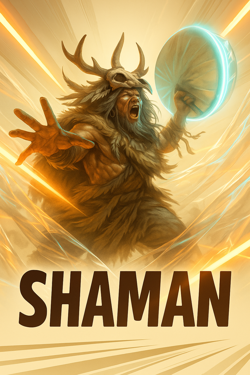 A powerful shaman figure, adorned with antlers, energetically plays a drum, surrounded by dynamic lines and glowing neon accents. The scene is bright with a misty beige and brown backdrop.