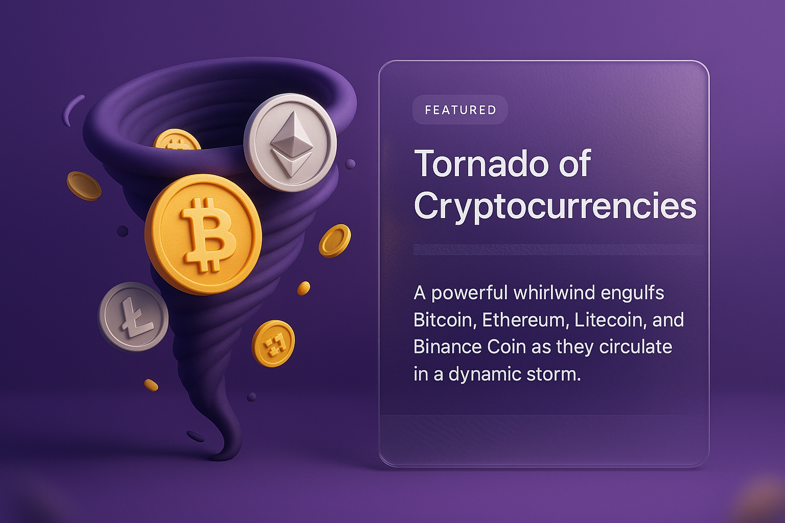 /Collection: /by davooda/Type: PNG/A striking 3D illustration of a tornado made of cryptocurrencies including Bitcoin, Ethereum, and others, set against a smooth gradient background with a transparent block for text.