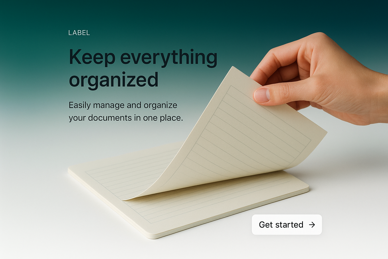 A clean, minimalist web design featuring a hand flipping through a notebook, with small text elements and a clear call-to-action button. The background transitions from a dark gradient to white.