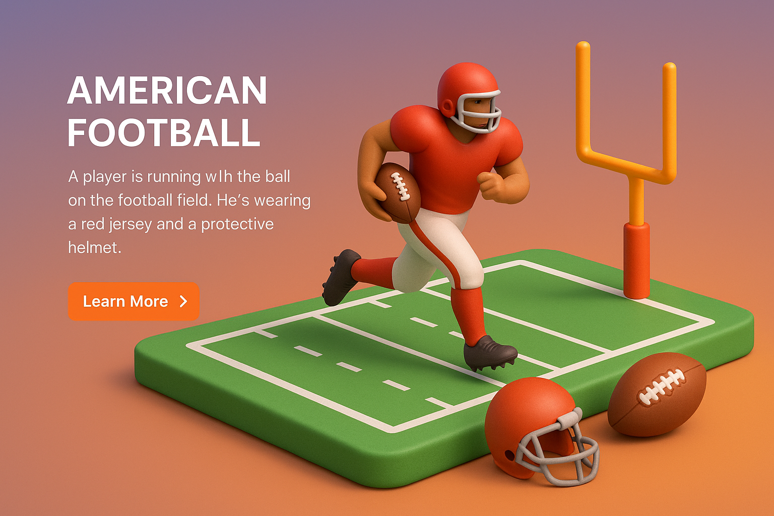 /Collection: /by davooda/Type: PNG/A detailed 3D illustration depicting a player running with a football on a vibrant field. The player is in a red jersey and a helmet, with goalposts and additional footballs in the scene.