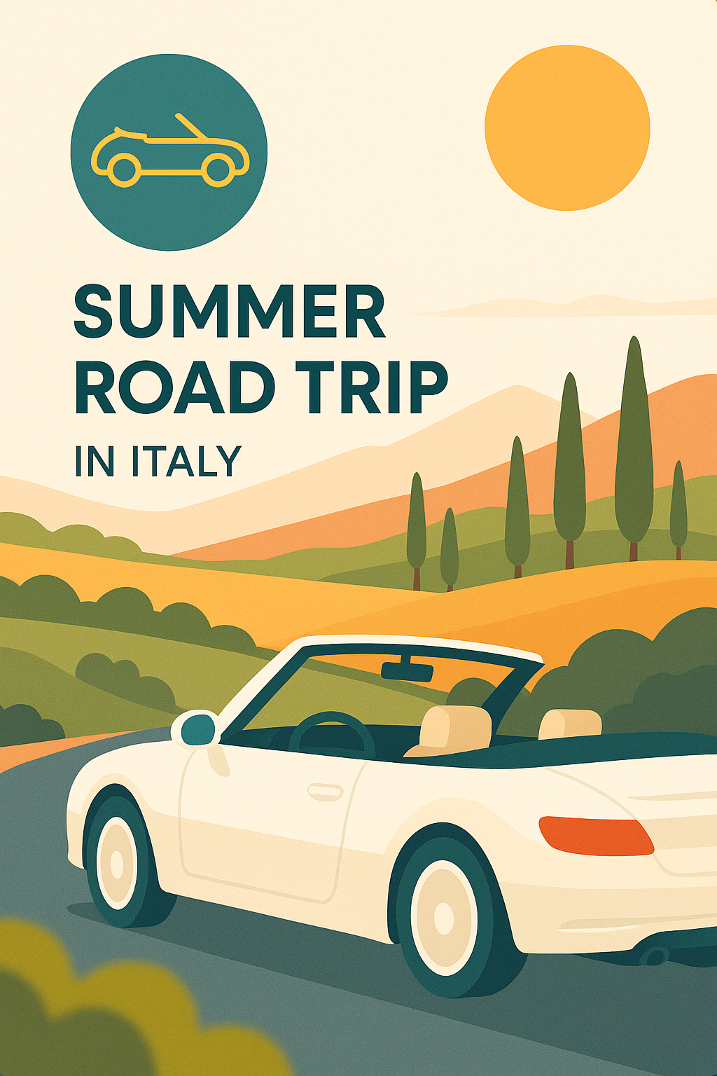 A vibrant and minimalist illustration depicting a convertible car on a scenic road in Italy, ideal for travel promotions and vacation planning.