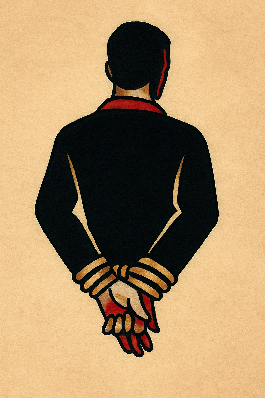 /Collection: /by davooda/Type: PNG/This image features a silhouetted figure with hands bound behind their back, adorned with a colorful tattoo. The background is a soft beige, enhancing the artistic elements.