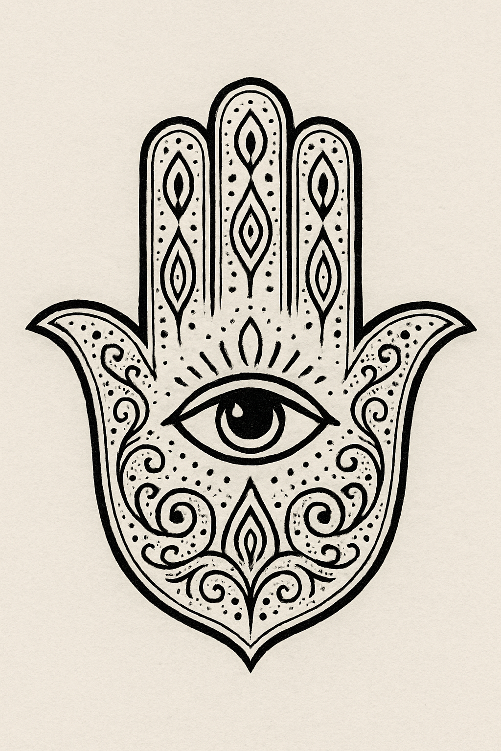Artistic illustration of a Hamsa hand with an eye