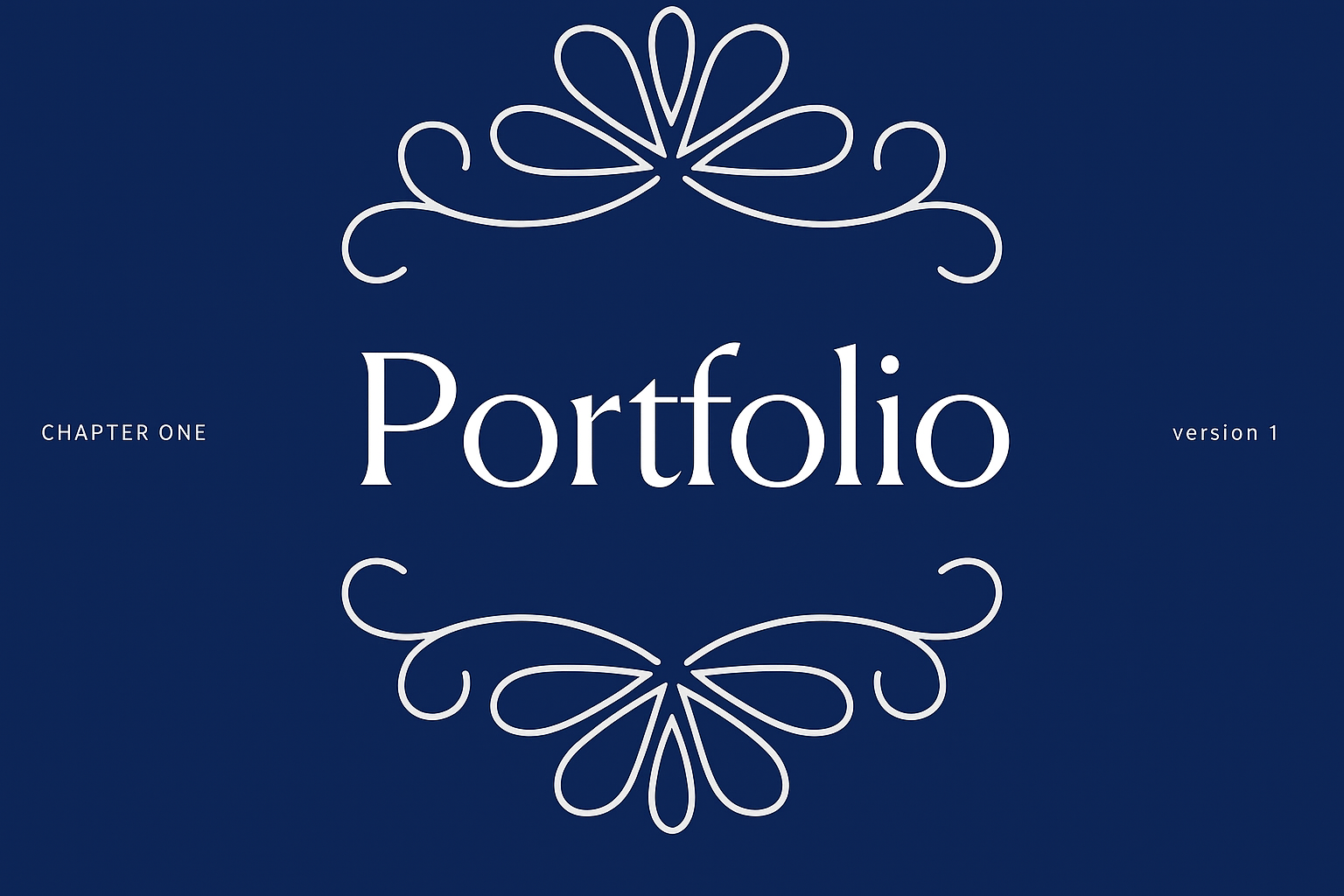 This image features a stylish portfolio cover with intricate geometric patterns and elegant typography against a deep blue background.
