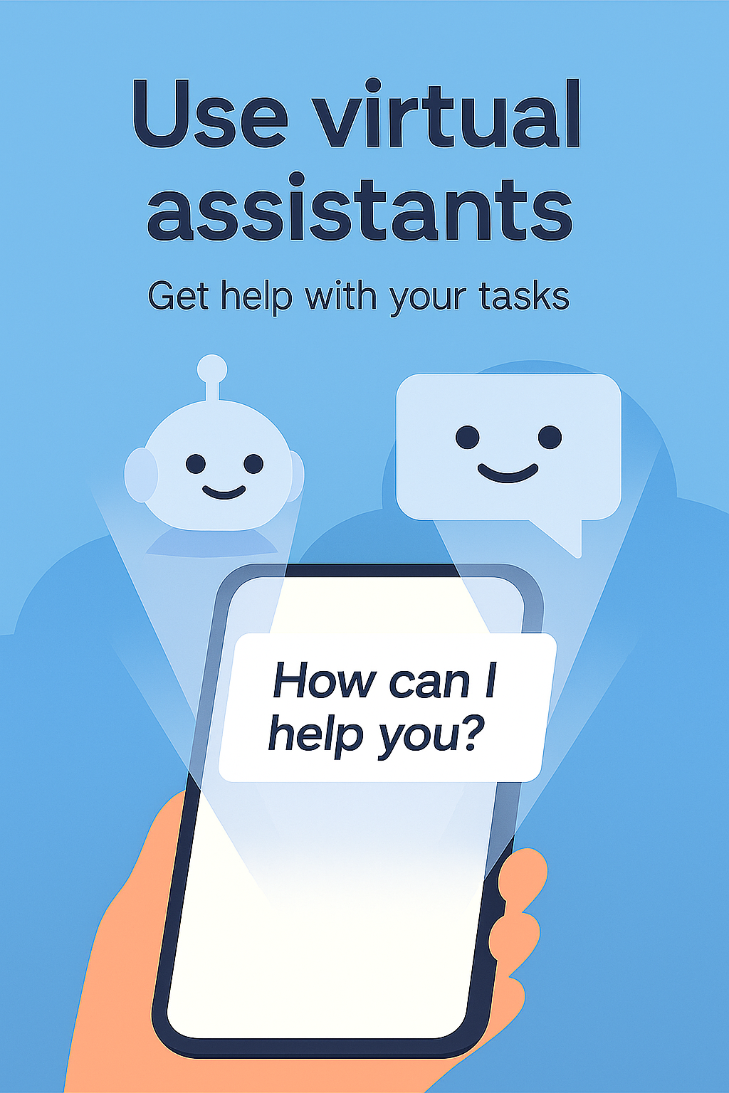 /Collection: /by davooda/Type: PNG/Engaging promotional graphic highlighting the use of virtual assistants, featuring a friendly chatbot and a smartphone. Ideal for marketing campaigns focused on digital assistance.