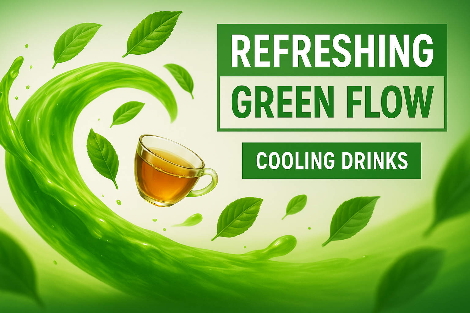 Colorful promotional graphic for cooling drinks, showcasing a dynamic green flow with a cup of tea. Ideal for marketing healthy beverages.