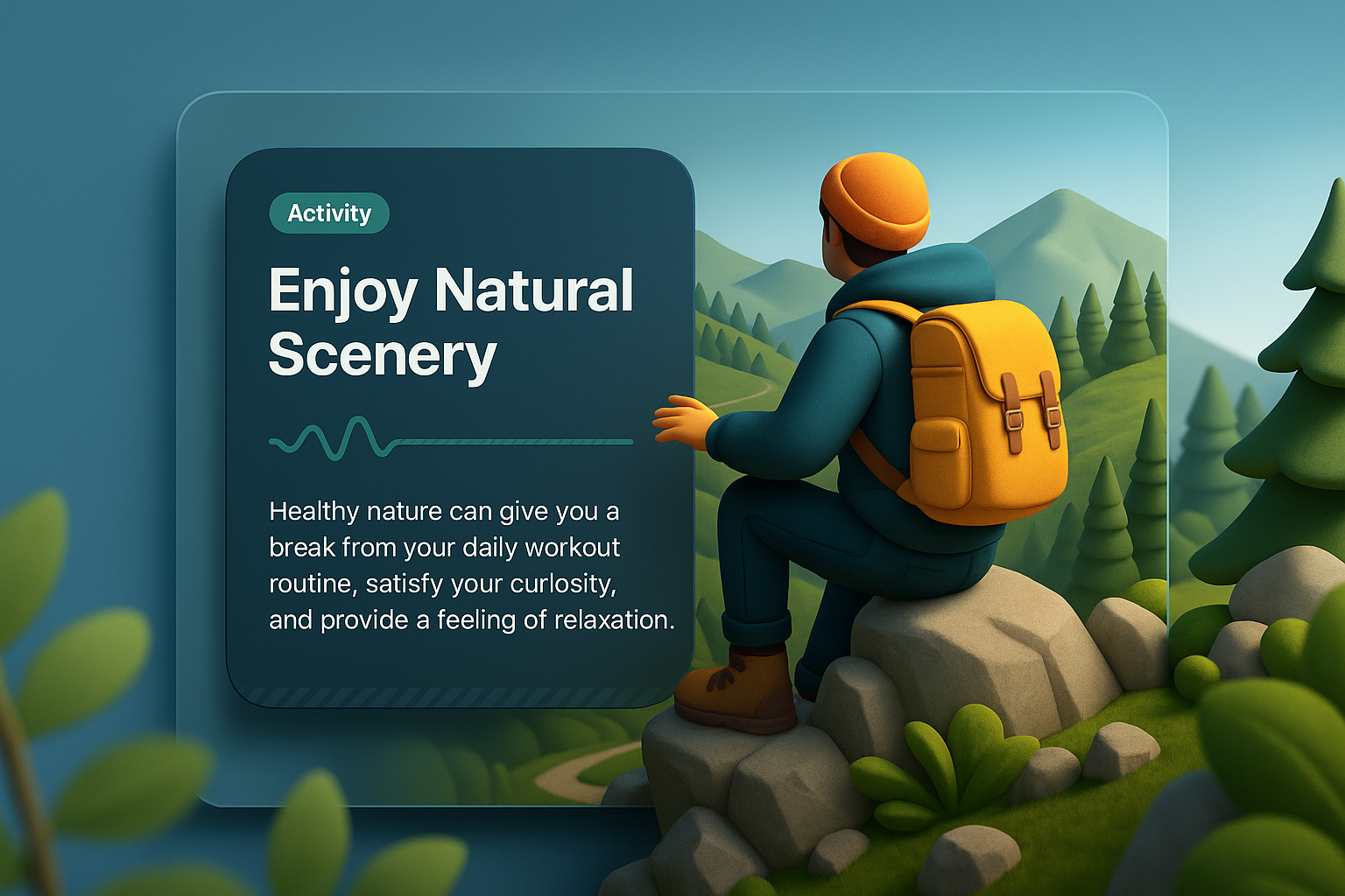 A 3D illustration of a hiker sitting on rocks, admiring lush green hills and trees. The design features a modern layout with integrated text that emphasizes relaxation in nature.