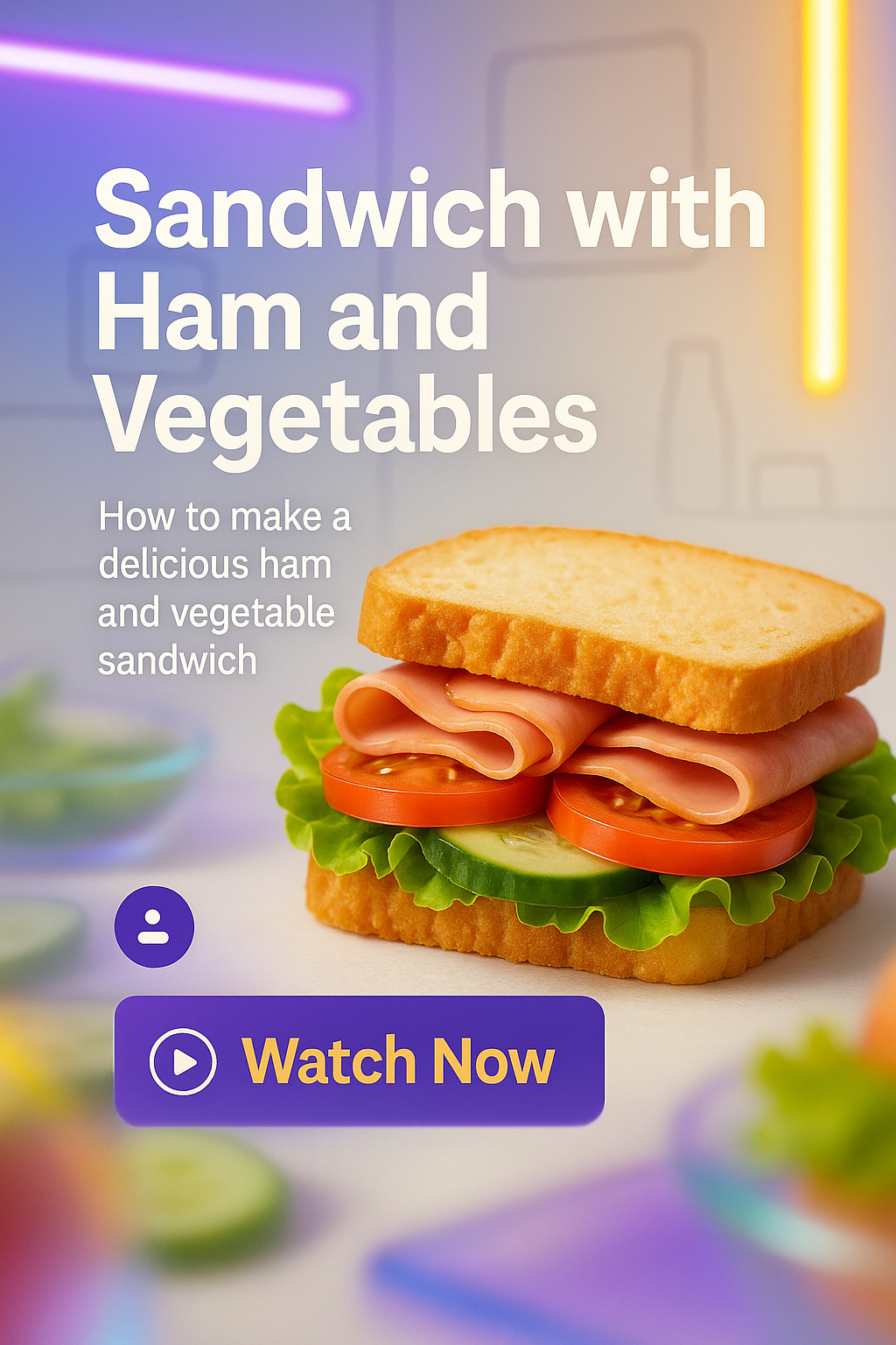 /Collection: /by davooda/Type: PNG/A visually appealing food tutorial graphic showcasing a sandwich with ham and vegetables, designed to attract viewers for a cooking video. The modern style and bright colors enhance the overall appeal.