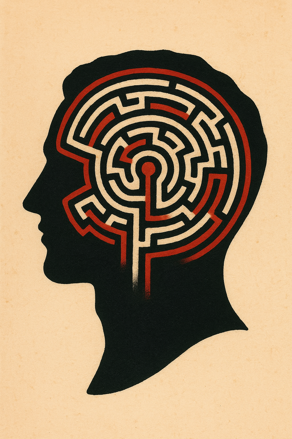 /Collection: /by davooda/Type: PNG/A striking tattoo design showcasing a silhouette of a head filled with a maze pattern. The colors are vivid against a slightly beige background, highlighting the intricate details.