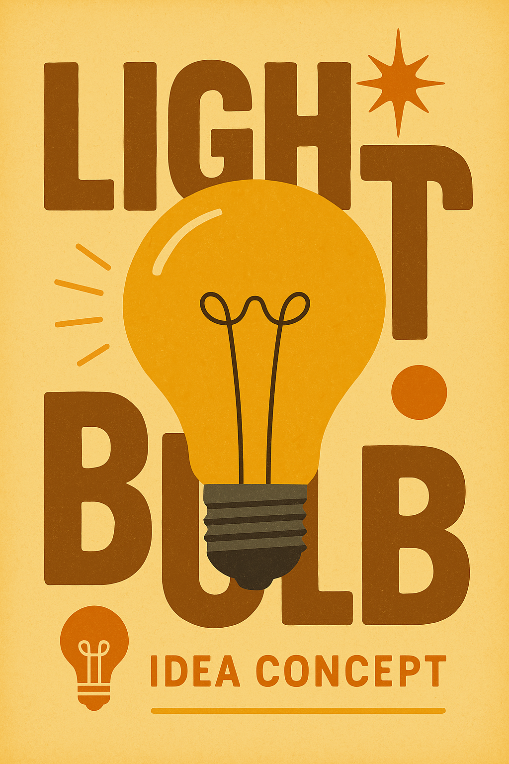 A vibrant illustration featuring a light bulb as a central theme, symbolizing ideas and creativity. The retro style with bold typography makes it ideal for presentations or inspirational content.