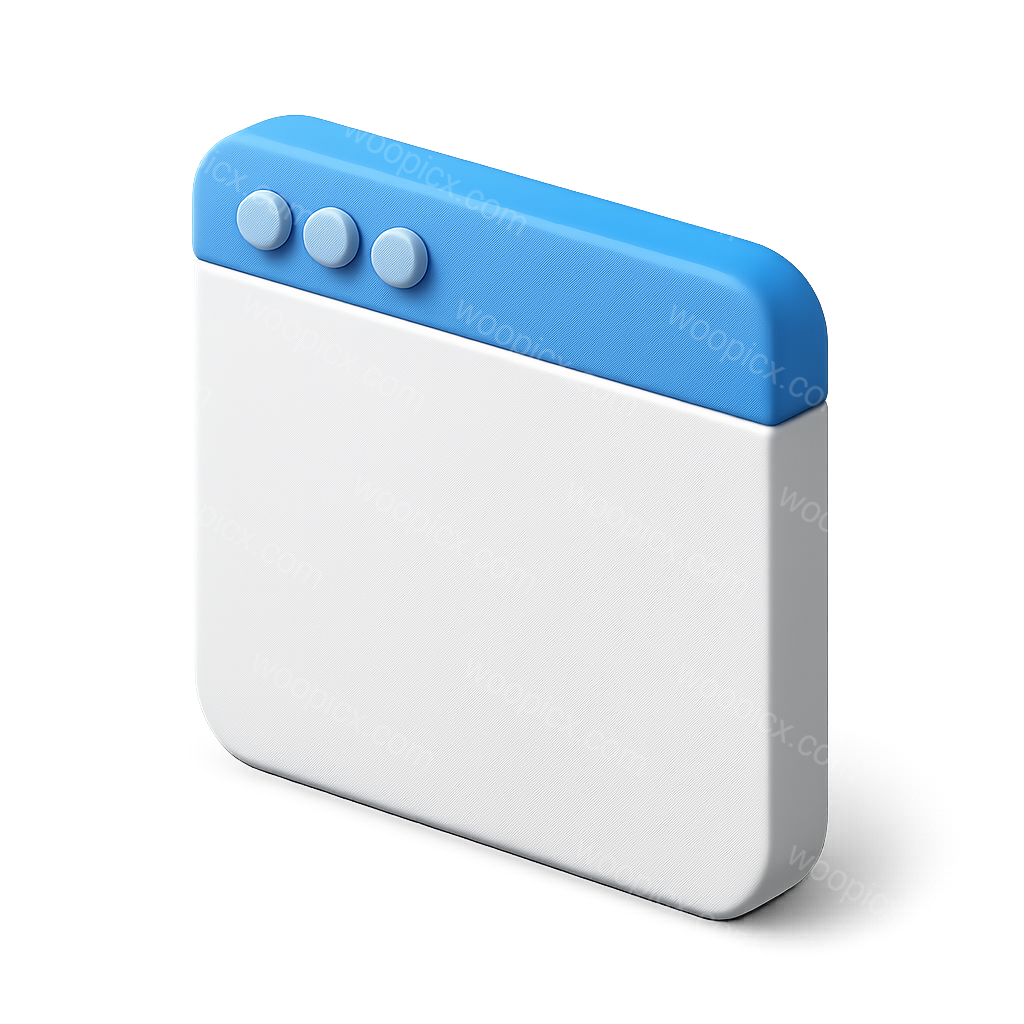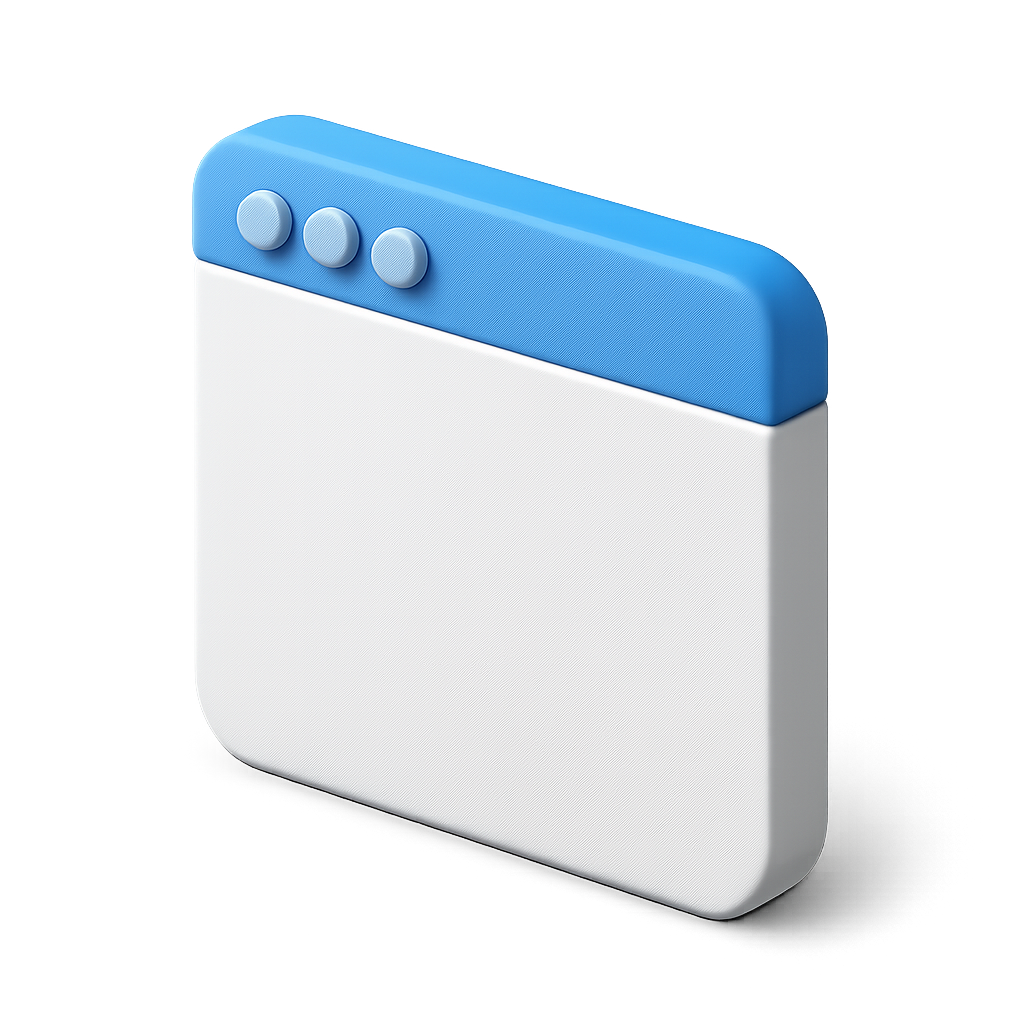A minimalist 3D icon of a browser tab featuring a blue top bar and three circular buttons. The design is volumetric with a transparent background, showcasing an isometric perspective.