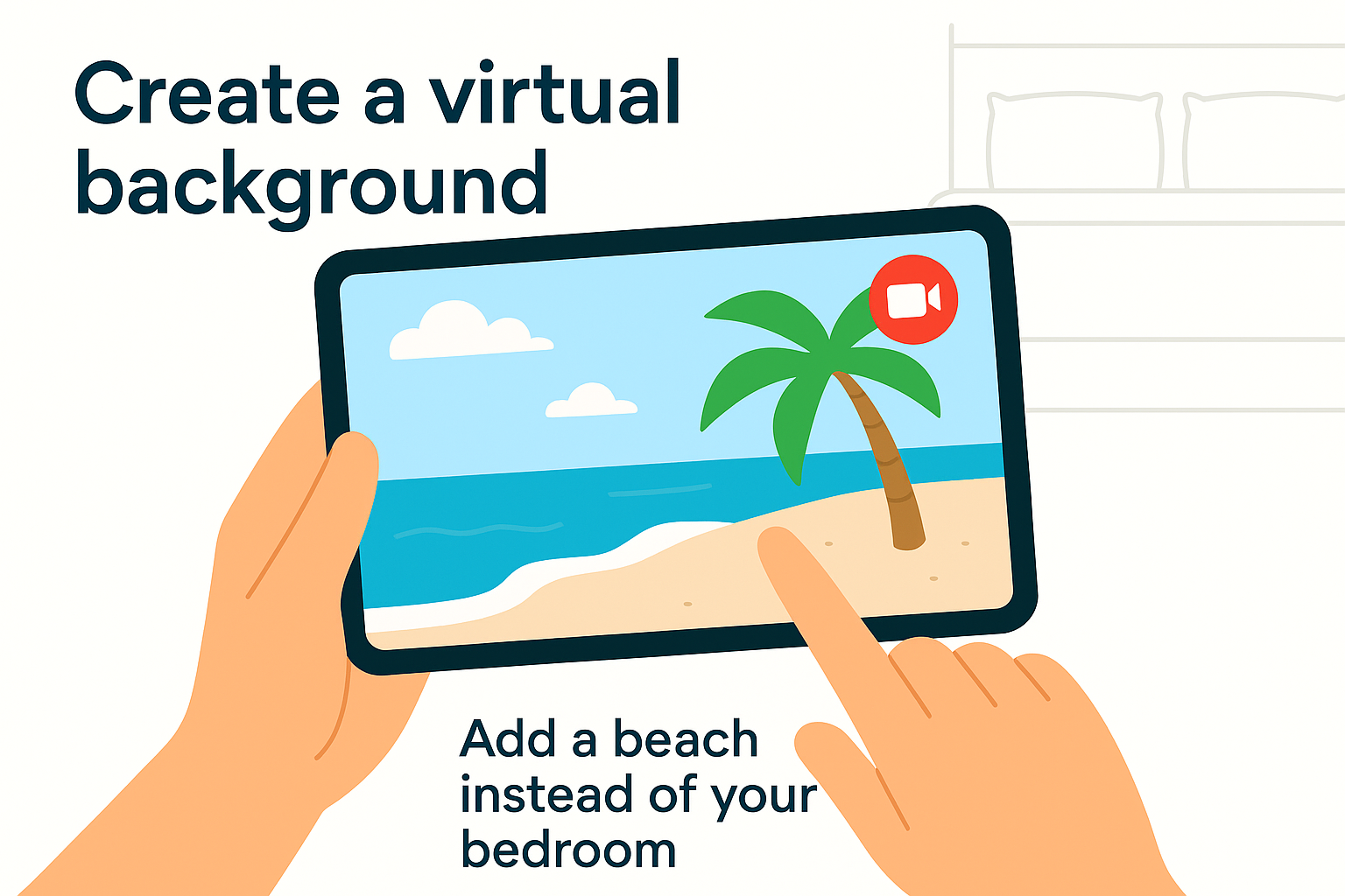 Illustrative graphic showcasing a hand holding a tablet with a beach scene, designed to promote the use of virtual backgrounds for video conferencing. Ideal for tech and remote work audiences.