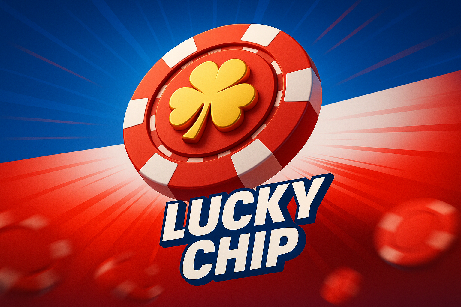 A vibrant three-layered design showcasing a 3D lucky chip against a dynamic background. The composition features a gradient backdrop with striking colors and depth elements.
