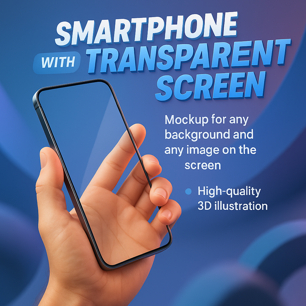 /Collection: /by davooda/Type: PNG/This is a 3D illustration of a smartphone with a transparent screen held in a hand. Ideal for showcasing app designs or digital content against various backgrounds.