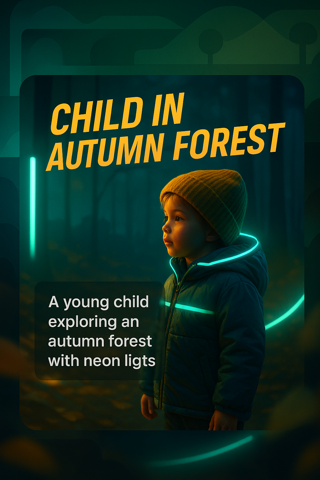A captivating image of a young child exploring an autumn forest, enhanced with neon lighting effects, creating a whimsical atmosphere. Ideal for storytelling and children’s themes.