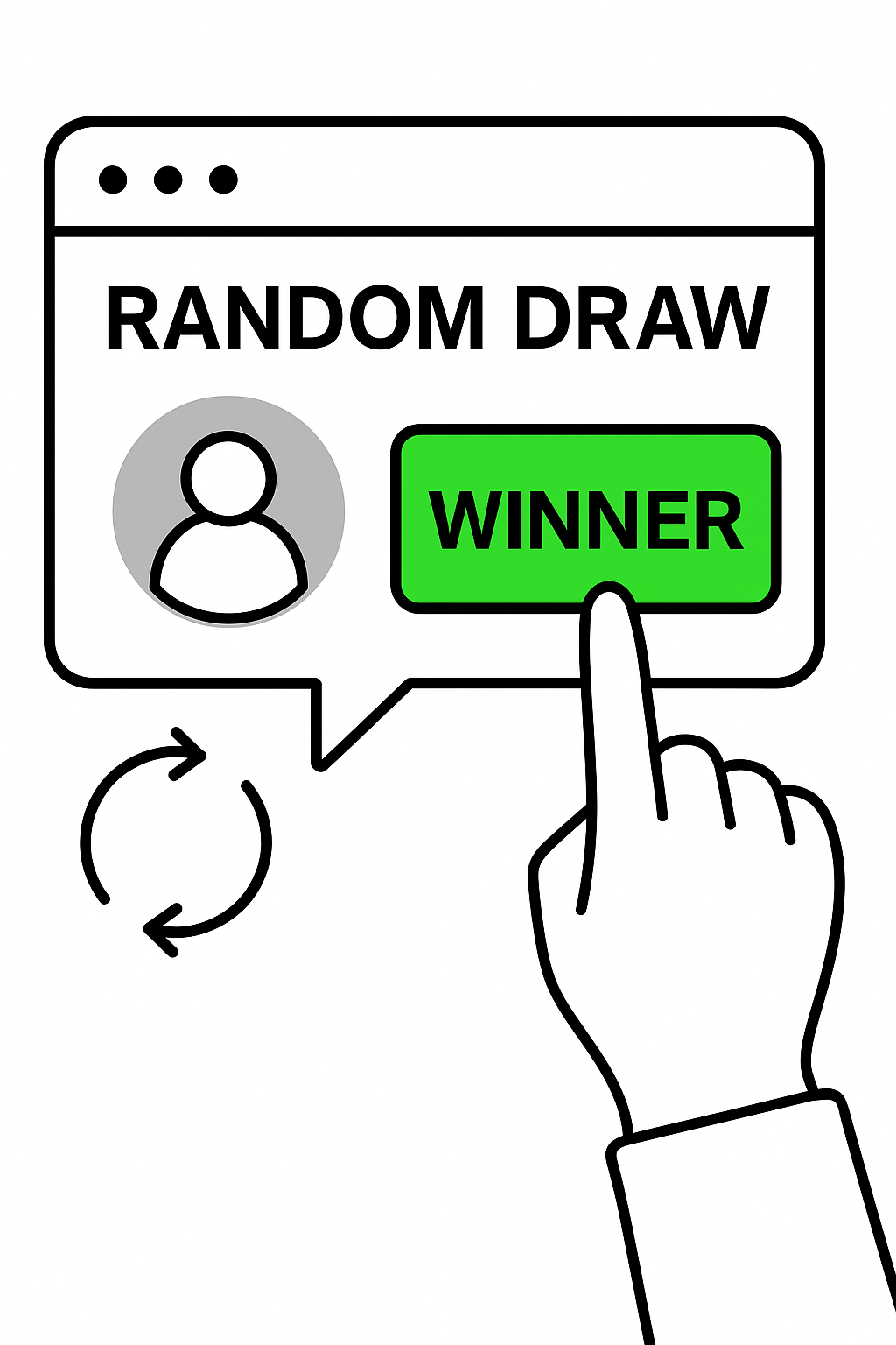 Simple and modern graphic depicting a hand selecting a winner from a digital random draw. Ideal for contests and giveaways.