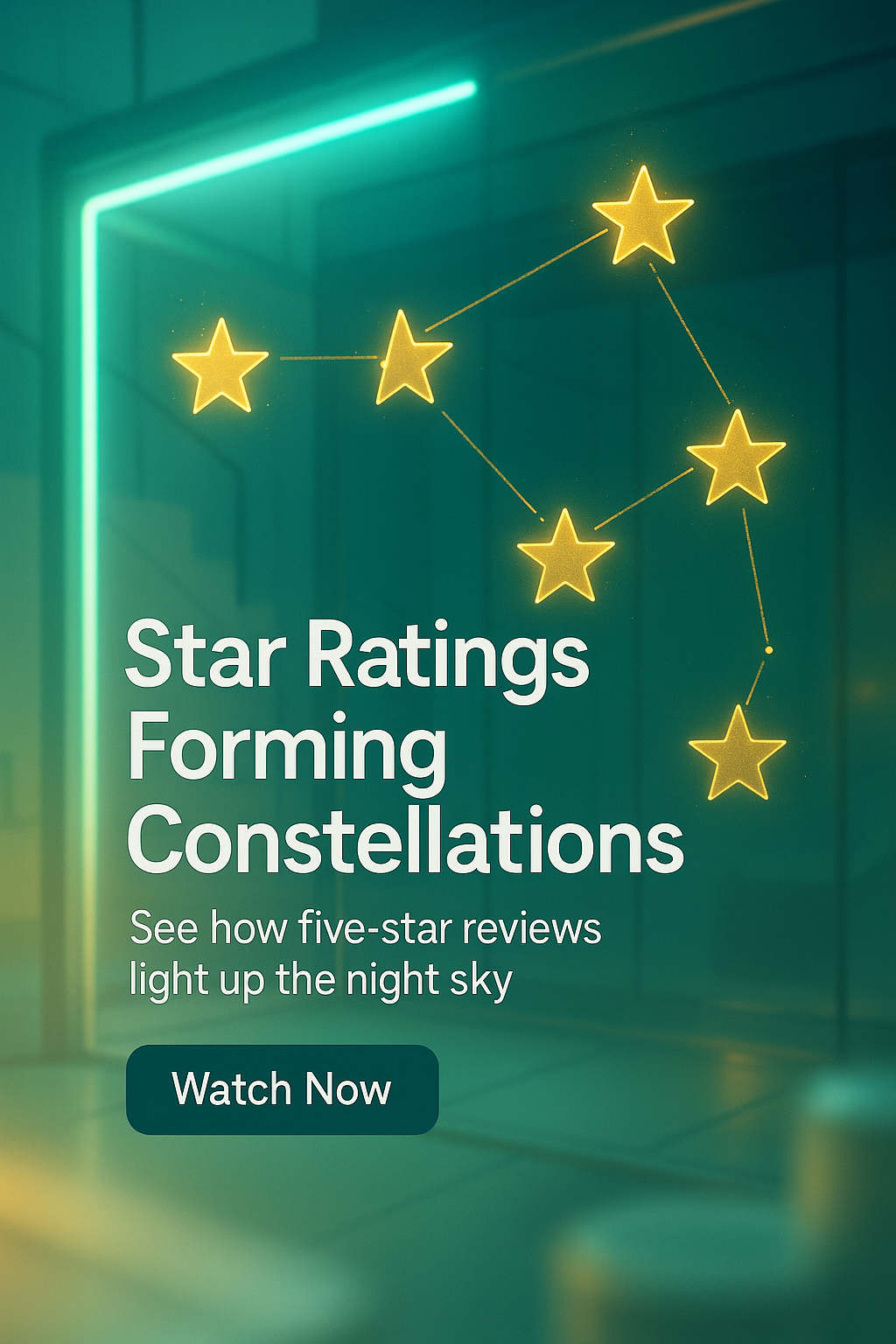 Promotional Graphic Featuring Star Ratings and Constellation Theme