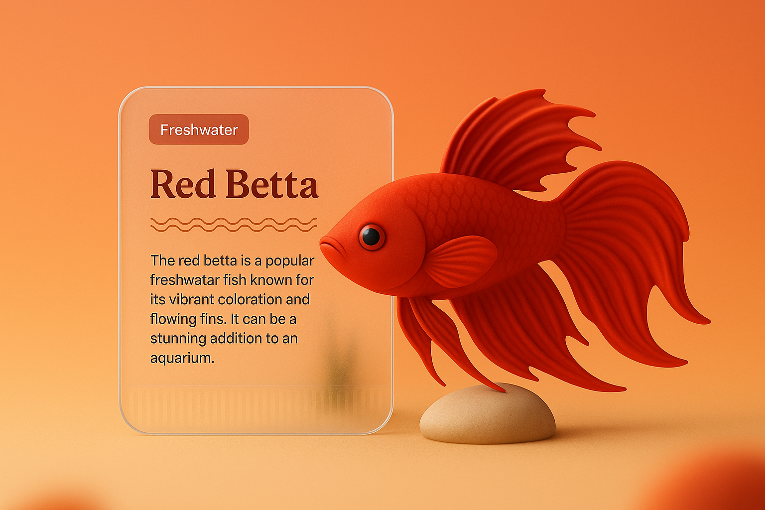 /Collection: /by davooda/Type: PNG/A vibrant 3D illustration of a red betta fish beside an informational block displaying its features. The background features a smooth gradient, enhancing the visual appeal.