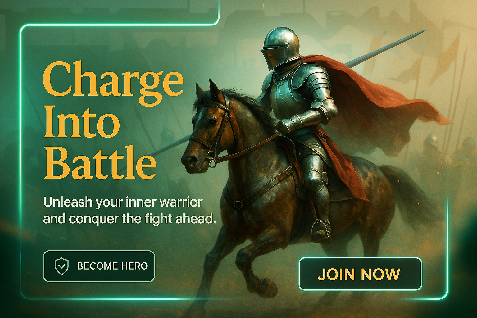 /Collection: /by davooda/Type: PNG/Dynamic promotional banner showcasing a knight charging into battle on horseback, designed to evoke excitement and adventure for gaming or fantasy audiences.