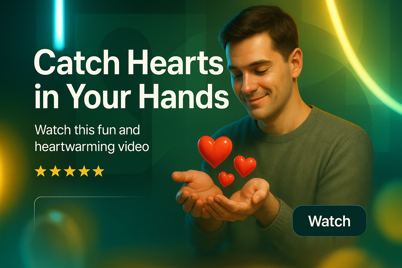 Vibrant promotional graphic for a heartwarming video, featuring a smiling individual holding floating hearts, ideal for social media engagement and video marketing.