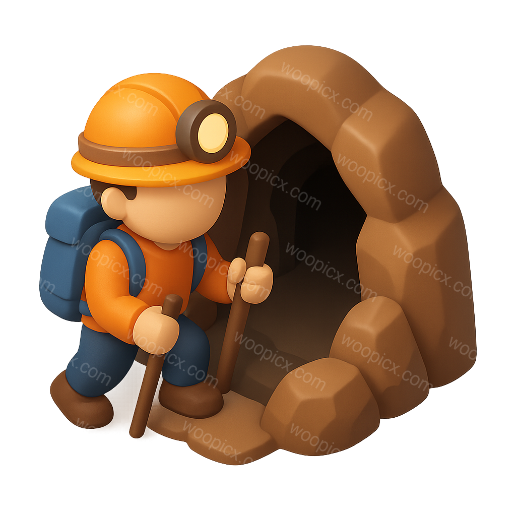 /Premium/Collection: /by davooda/Type: PNG/A 3D icon of a spelunker wearing a helmet and backpack, holding trekking poles, standing at the entrance of a cave. The design features a volumetric and isometric style.