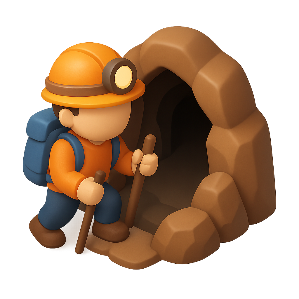 /Collection: /by davooda/Type: PNG/A 3D icon of a spelunker wearing a helmet and backpack, holding trekking poles, standing at the entrance of a cave. The design features a volumetric and isometric style.
