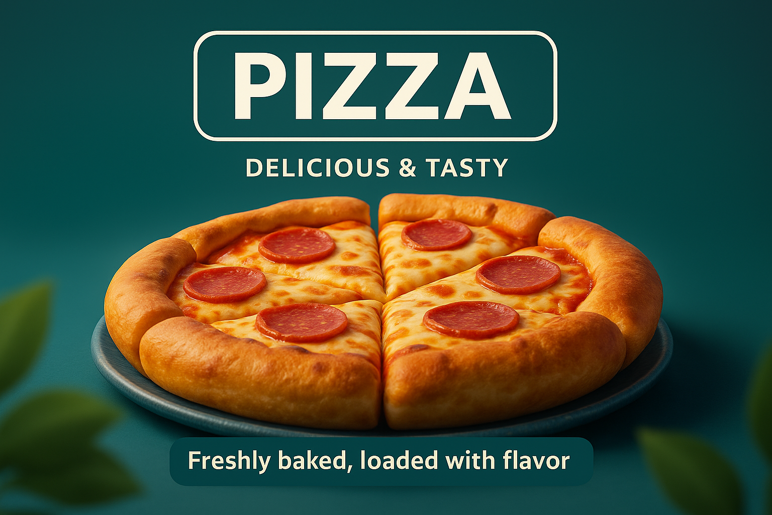 A visually striking 3D illustration of a pizza showcasing pepperoni and cheese, set against a gradient background. The bold title emphasizes deliciousness.
