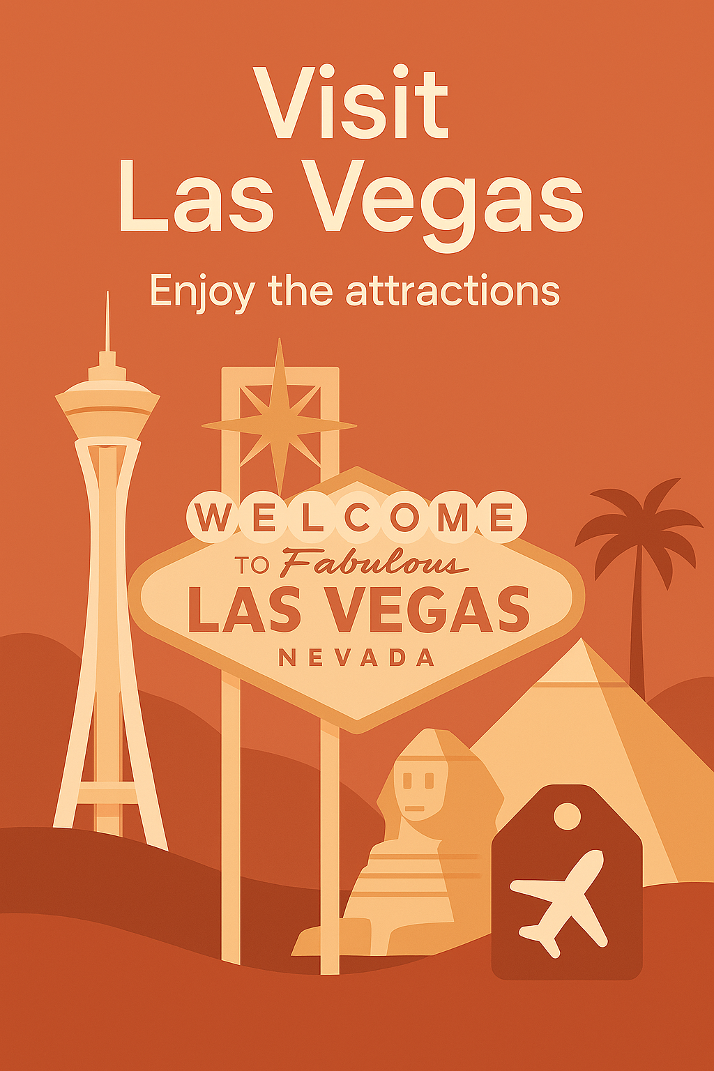 A vibrant travel poster showcasing Las Vegas attractions with a modern design style. Ideal for tourism promotion and travel marketing.