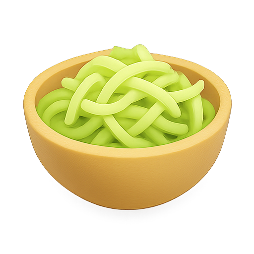 A vibrant 3D rendering of a bowl filled with green noodle-like shapes, showcasing a playful and whimsical design suitable for food-related themes or playful illustrations.