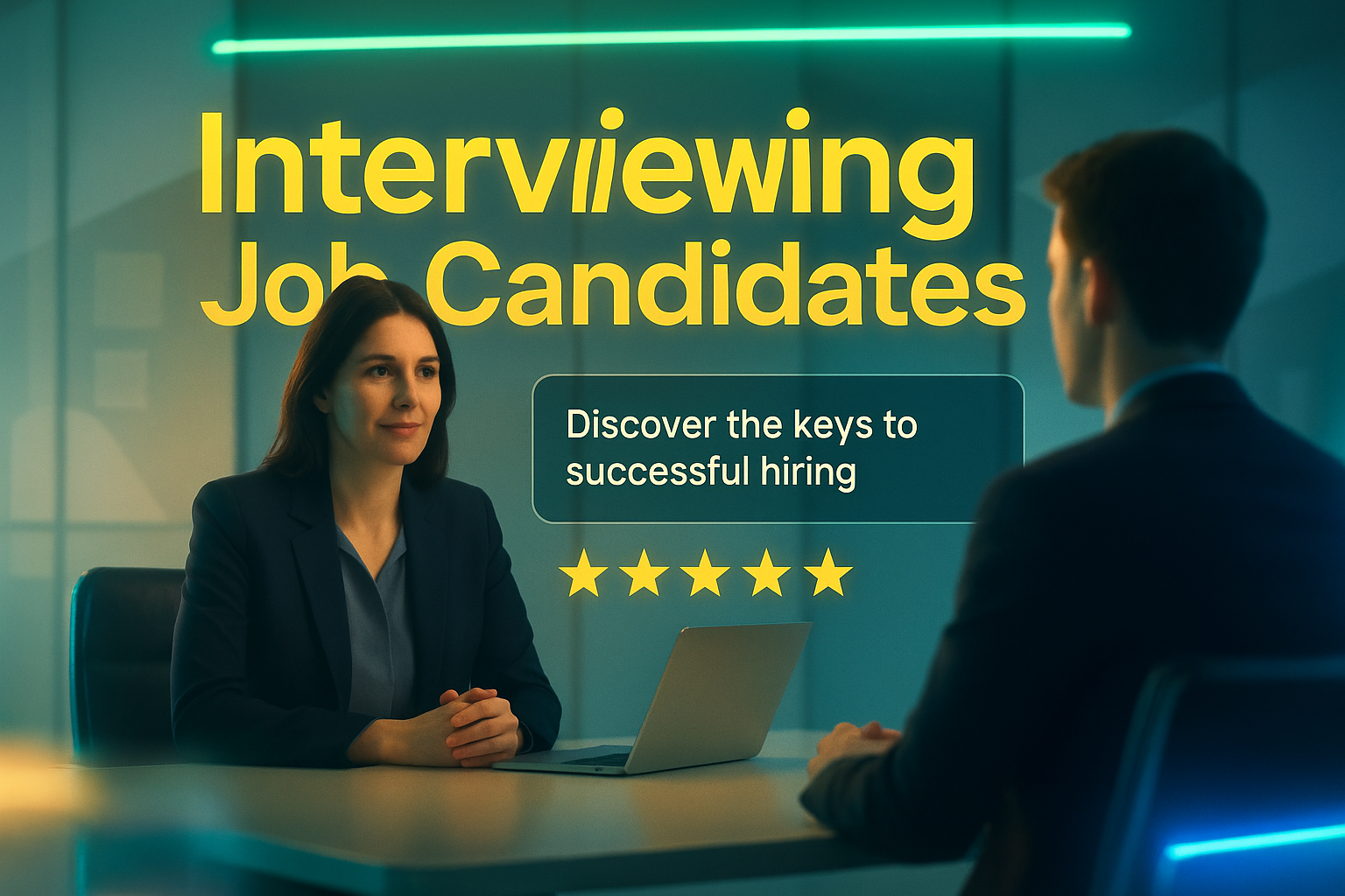 Engaging promotional image focused on interviewing job candidates, featuring a modern design with a business setting, suitable for HR training or recruitment marketing.