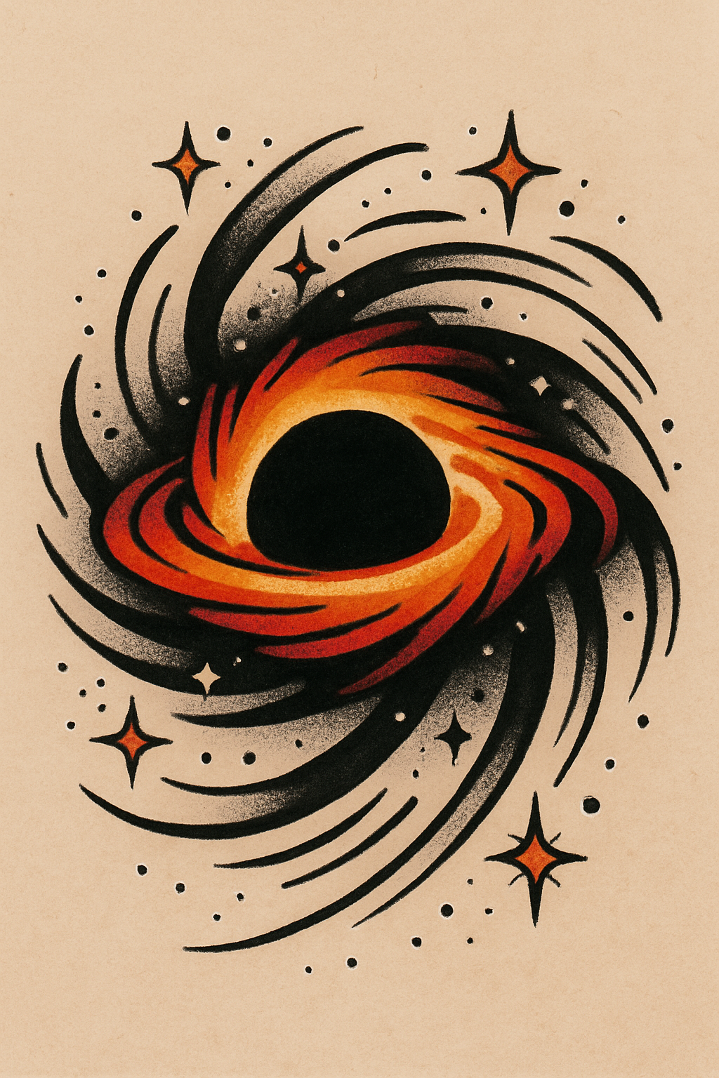 This is a stylized graphic representation of a black hole surrounded by swirling cosmic elements and stars. Ideal for cosmic-themed projects and art.