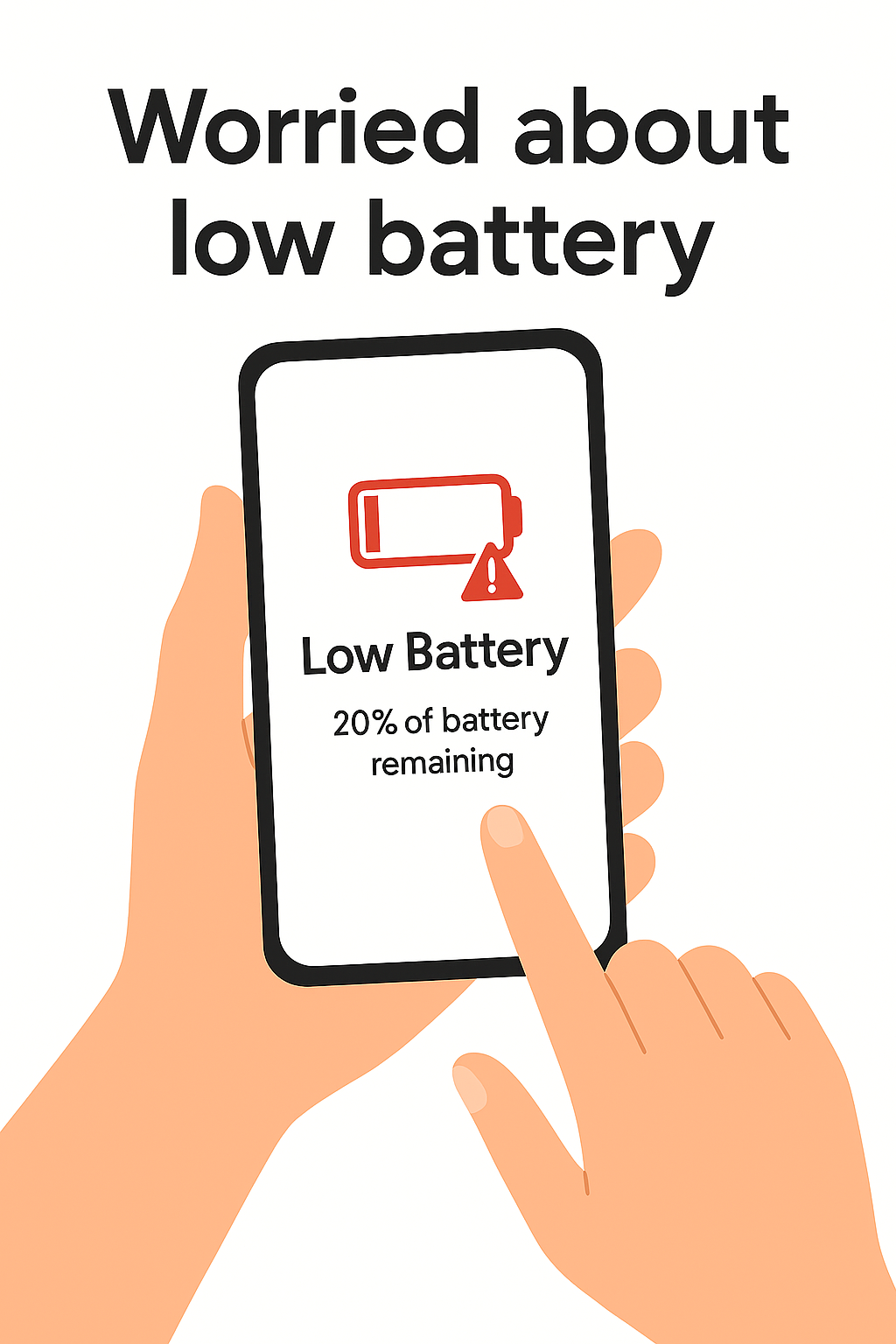 /Collection: /by davooda/Type: PNG/Digital illustration featuring a smartphone displaying a low battery warning, aimed at conveying urgency and awareness about battery life. Suitable for tech-related content.