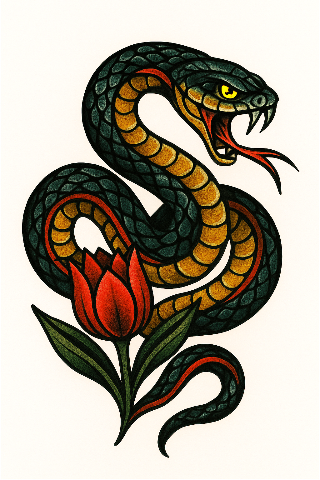 This image features a stylized tattoo design of a snake coiled around a flower, showcasing bold colors and intricate detailing, ideal for tattoo enthusiasts.