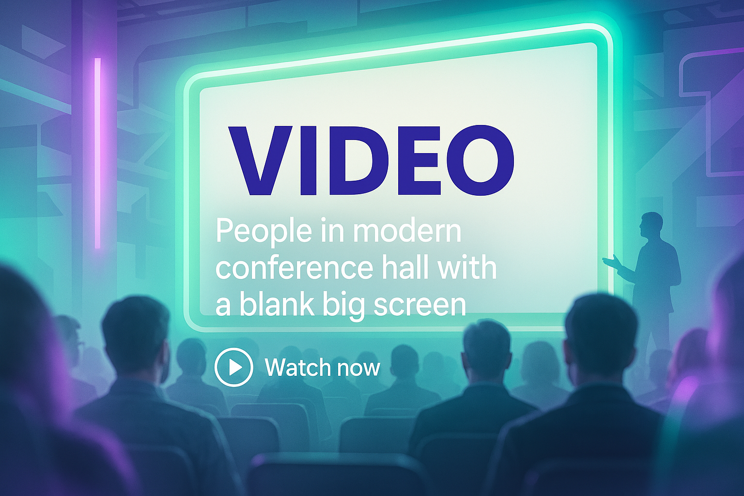 /Collection: /by davooda/Type: PNG/Digital illustration depicting a modern conference environment with an audience and a blank big screen, ideal for video content promotion or event marketing.